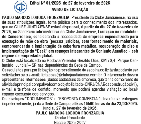 Interessados precisam encaminhar um e-mail para licitacoes@clubejundiaiense.com.br com os seguintes dados: